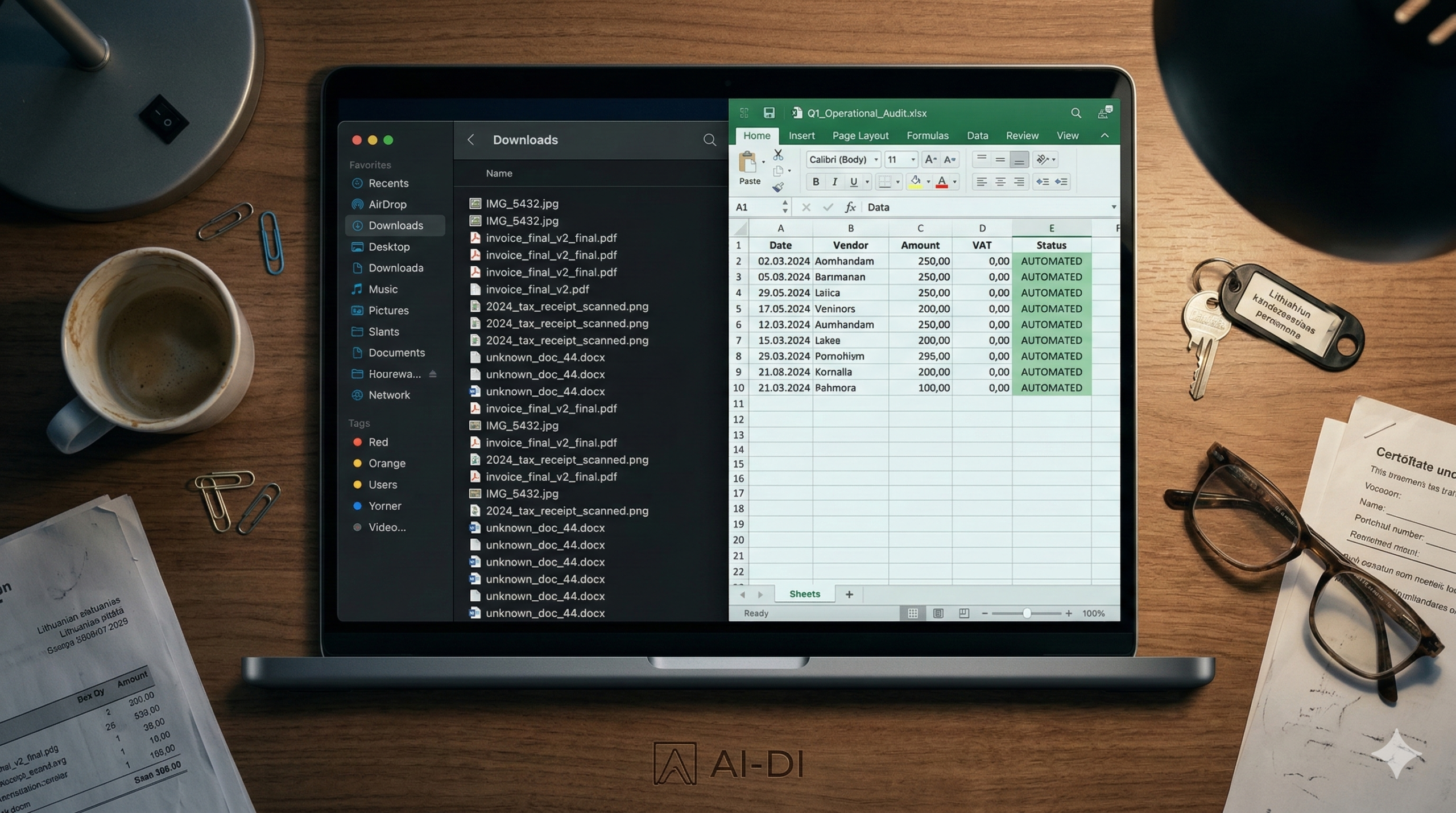 Nereikia rašyti nė vienos „Python“ kodo eilutės – pakanka įkelti dvidešimt taksi kvitų į aplanką. Atidarius „Cowork“ kortelę įrašoma komanda: „Perskaityk šiuos kvitus, išgauk datas, sumas bei prekybininkų pavadinimus ir sukurk suformatuotą „Excel“ išlaidų ataskaitą“.
