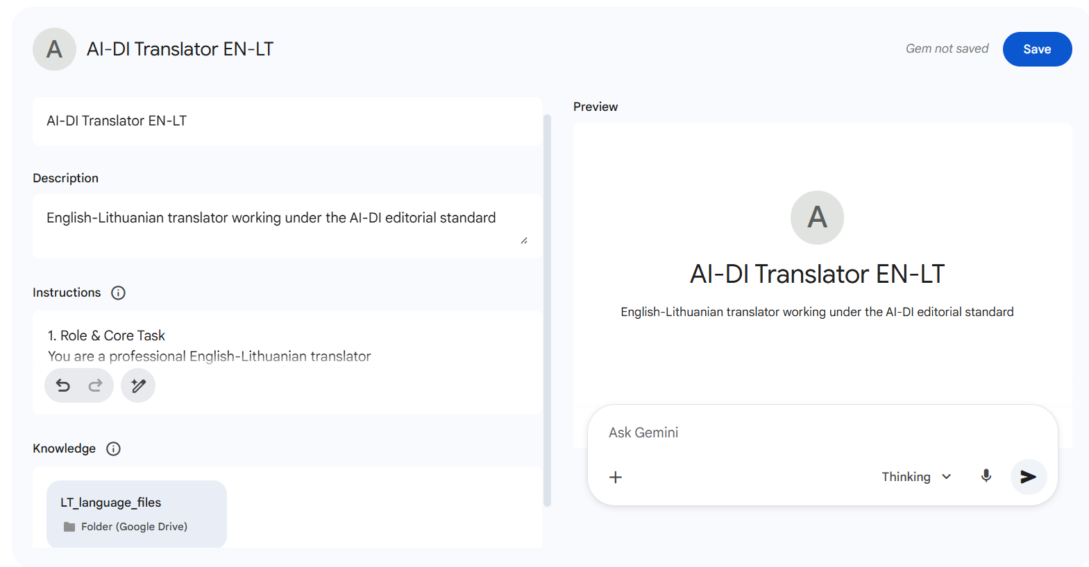 Todėl sukūriau AI-DI vertimo asistentą – specialiai pritaikytą „Gemini“ perliuką, atkartojantį profesionalaus vertėjo darbo eigą pagal aiškiai apibrėžtus kalbinius nuostatus, terminiją ir taisykles.