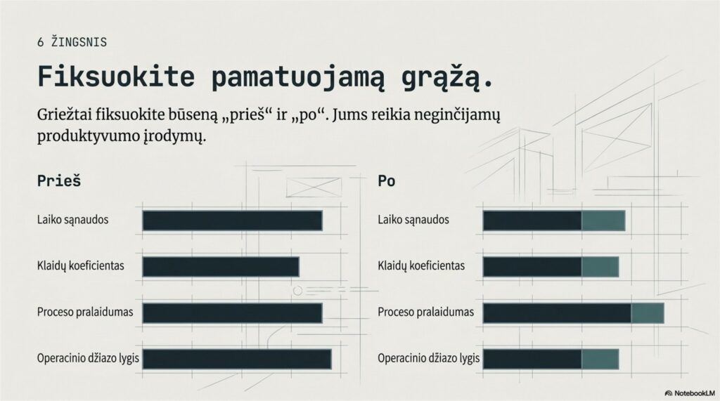 Griežtai fiksuokite būseną „prieš“ ir „po“. Jums reikia neginčijamų produktyvumo įrodymų. Tik matomas rezultatas patvirtina, kad jūsų sukonstruotas „natų lapas“ veikia, o investicija į DI architektūrą virsta realiu įmonės turtu.