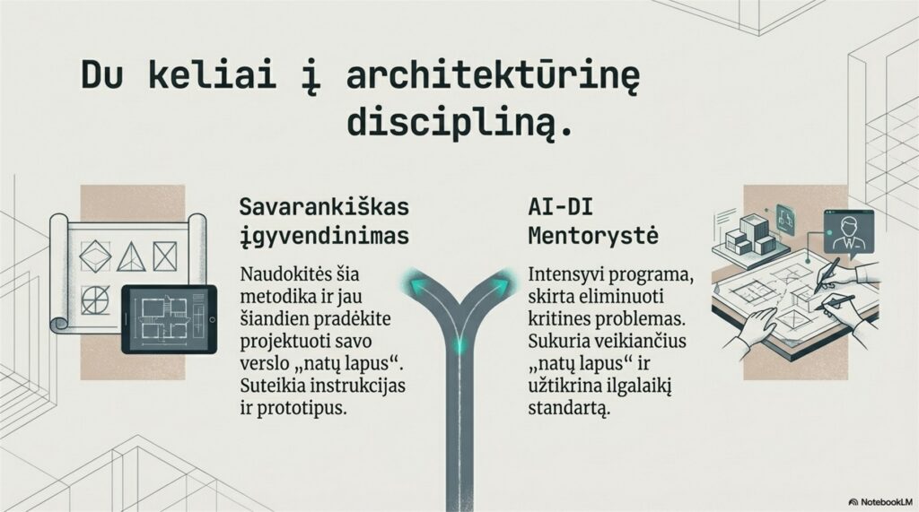 Jei esate MVĮ vadovas ar savininkas, šiuo metu skęstantis operaciniame džiaze, jūsų laukia du fundamentalūs pasirinkimai. Galite savarankiškai pasinaudoti šia AI-DI metodika ir jau šiandien pradėti projektuoti savo verslo „natų lapus“.