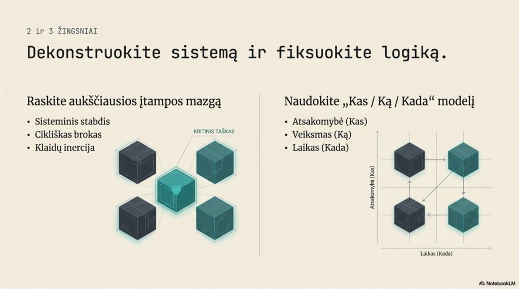 Kiekvienas „aukščiausios įtampos mazgas“ privalo būti dekonstruotas į atomines dalis naudojant „kas / ką / kada“ modelį. Tai yra jūsų architektūrinė disciplina: kiekviena sistema susideda iš užduočių, o kiekviena užduotis – iš konkrečių, pamatuojamų veiksmų.