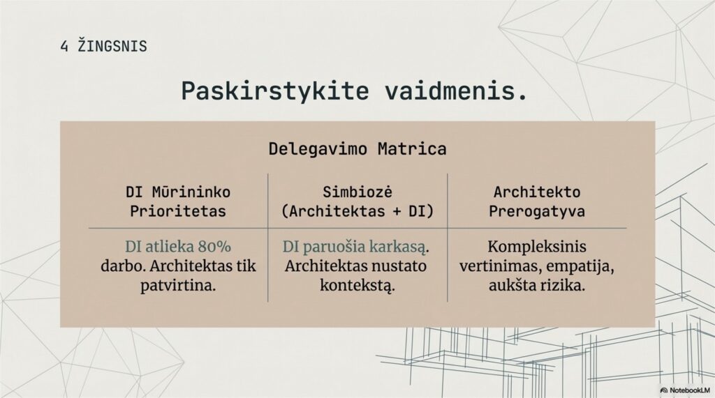 4️⃣ Vaidmenų paskirstymas: architektas prieš DI mūrininką