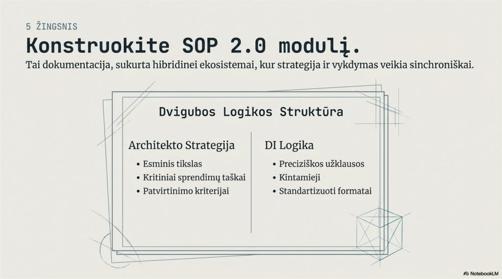 Užuot kūrę dešimtis puslapių korporacinių aprašų, projektuokite kompaktišką SOP 2.0 modulį. Tai jūsų architektūrinė disciplina, leidžianti DI mūrininkui ir jūsų komandai veikti be papildomų interpretacijų.